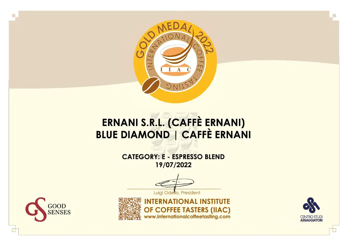 Caffè Ernani Blue Diamond 1 kg ist der prestigeträchtigste 100% Arabica Blend der italienischen Rösterei Caffè Ernani. Er wurde 2022 mit der Goldmedaille – Gold Medal 2022 ausgezeichnet und zählt zu den meistprämierten italienischen Arabica-Espressi seiner Klasse. Ein komplexes Aromaprofil mit Früchten, Zitrus, weißen Schokoladennoten, Honig, Mandeln und Nüssen macht ihn zu einem der feinsten italienischen Gourmetkaffees am Markt.